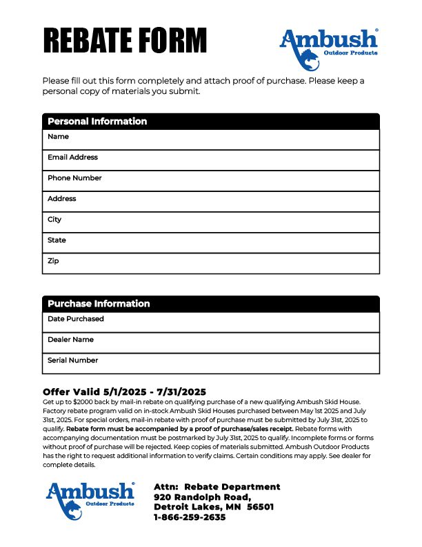Get up to $2000 back by mail-in rebate on qualifying purchase of a new qualifying Ambush Skid House. Factory rebate program valid on in-stock Ambush Skid Houses purchased between May 1st 2025 and July 31st, 2025. For special orders, mail-in rebate with proof of purchase must be submitted by July 31st, 2025 to qualify. Rebate form must be accompanied by a proof of purchase/sales receipt. Rebate forms with accompanying documentation must be postmarked by July 31st, 2025 to qualify. Incomplete forms or forms without proof of purchase will be rejected. Keep copies of materials submitted. Ambush Outdoor Products has the right to request additional information to verify claims. Certain conditions may apply. See dealer for complete details.